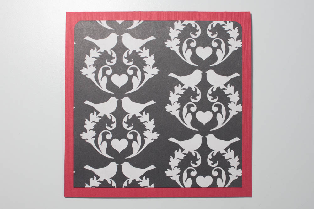 Make a card from a 5-by-10-inch piece of textured red cardstock. Cut a 4 1/2-inch-square piece of black-and-white, bird-and-heart patterned cardstock (I used “Love Birds” from the Love Story collection by Echo Park Paper Co.), round the top corners and adhere it, centered, to the card’s front.