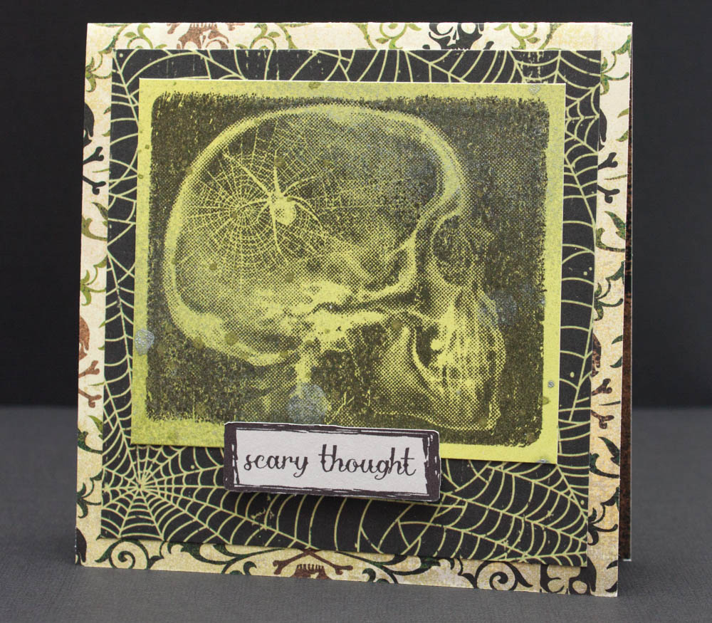 Make a card from a 5-by-10-inch piece of multicolored, skull-patterned cardstock (such as “Beware” from the Eerie collection by Basic Grey). Cut a 4 1/2-inch-square piece of black-and-light green, spiderweb-patterned cardstock (I used “Icky” from the Heebie Jeebies collection by We R Memory Keepers) and adhere it, centered, to the card’s front.