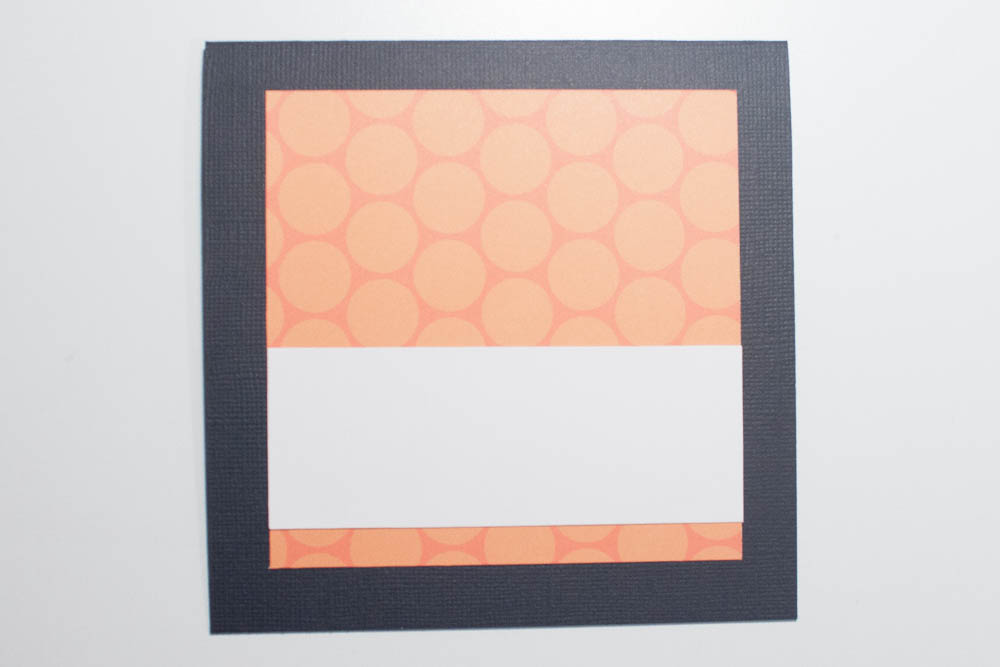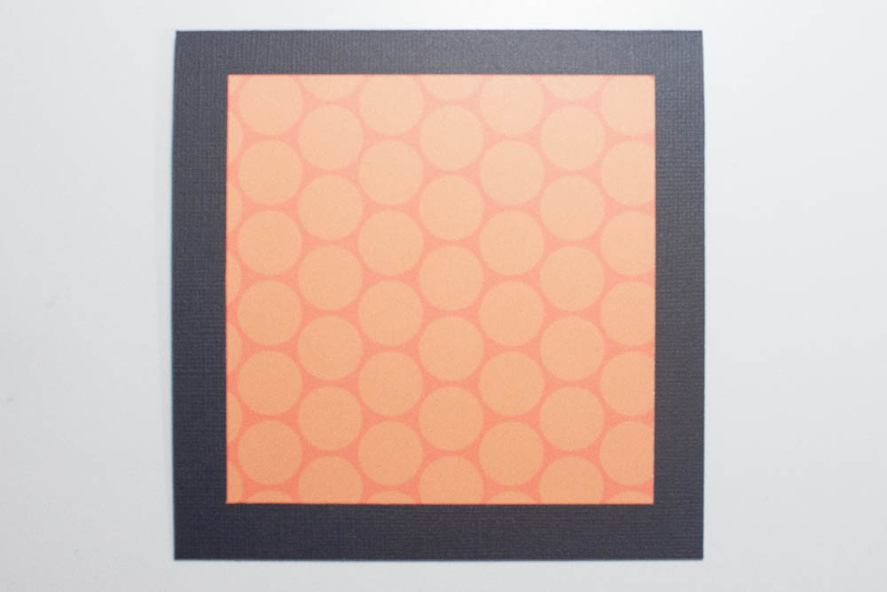 Make a card from a 5-by-10-inch piece of textured cardstock. Cut a 4-inch-square piece of orange cardstock featuring large polka dots (I used the reverse side of “Cob Webs” from the Haunted Manor collection by Doodlebug Design Inc.) and adhere it, centered, to the card’s front.