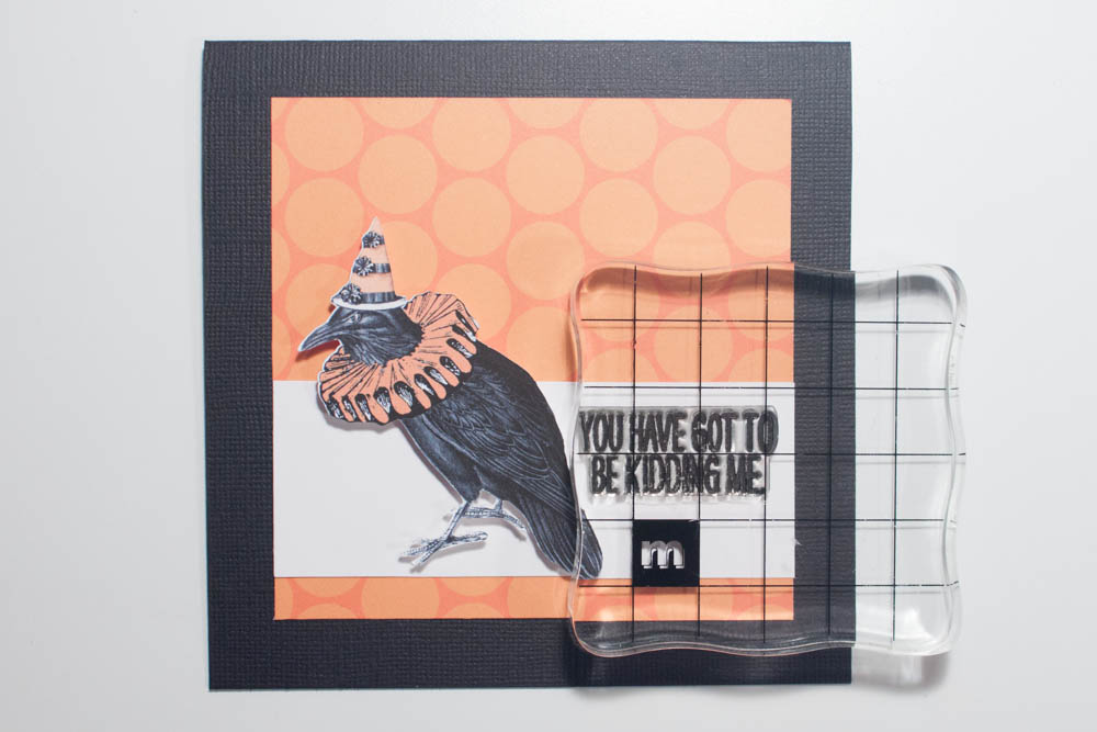 Stamp a humorous sentiment (such as “YOU HAVE GOT TO BE KIDDING ME” from the Nailed It collection designed by Shimelle Laine for Two Peas in a Bucket and Hero Arts) in black ink (mine’s Versafine in  onyx black) onto the white cardstock, next to the raven.