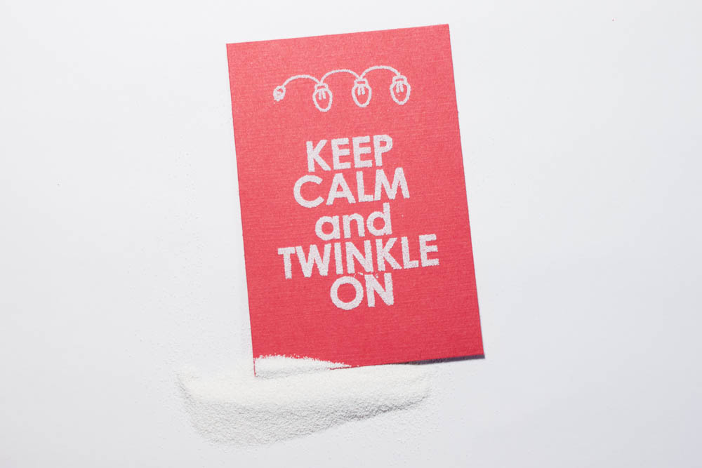 Cut a 2-by-3-inch piece of bright-red cardstock (Bazzill) and stamp “KEEP CALM and TWINKLE ON” with an image of a string of lights above it (mine are from the Twinkle On set by Technique Tuesday) in white ink (such as ColorBox Cat’s Eye Queue Baby’s Breath collection in frost white) onto this piece. Cover it with white embossing powder (I used American Crafts Zing! powder) and tap off the excess.