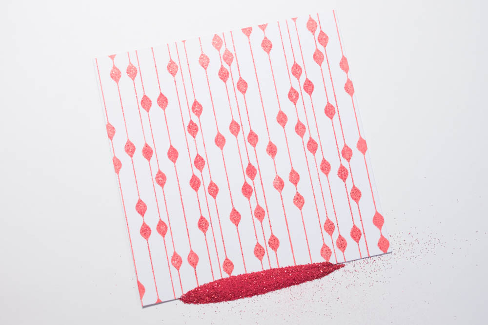 Cut a 4-inch piece of white cardstock. Stamp a retro background image (such as bead background from the Hipster collection by Hero Arts and Basic Grey) in neon-red ink (mine’s by Hero Arts) onto the white cardstcok, and cover it with red glitter embossing powder (I used Stamp ‘n Stuff powder by Stampednous! in red tinsel). Tap off the excess.