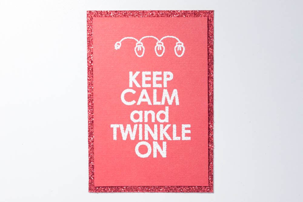Emboss the glitter powder. Cut a 2 1/4-by-3 1/4-inch piece of red glitter cardstock (such as Recollections glitter paper in rouge) and adhere the “keep calm” piece, centered, to it.