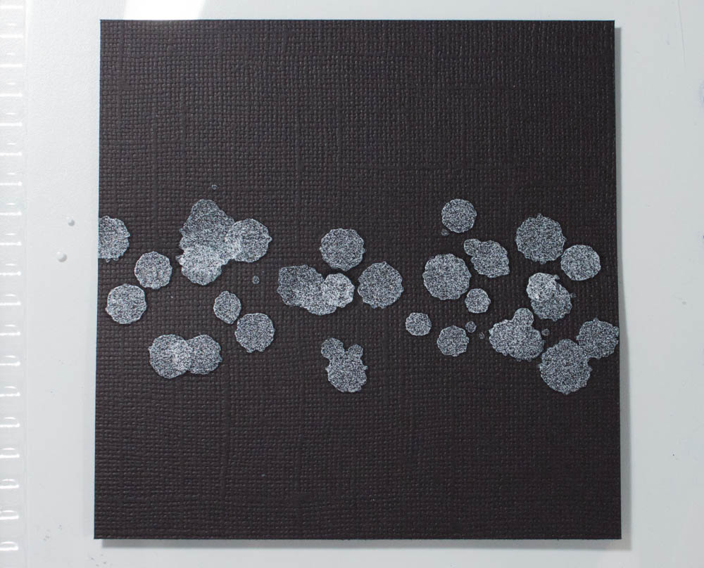 Cut a 4 1/2-inch-square piece of black textured cardstock. Drip pearlescent white paint mist (such as Heidi Swapp Color Shine in white) horizontally across the center of this piece. Allow the paint to dry.