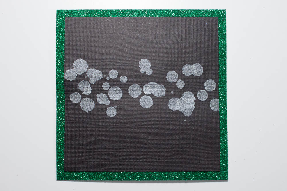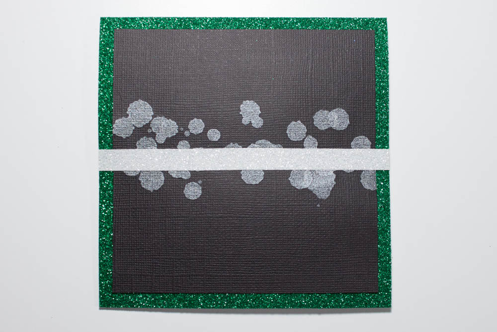 Make a card from a 5-by-10-inch piece of green glitter cardstock (mine’s The Paper Studio glitter cardstock in dark green) and adhere the black cardstock, centered, to the card’s front.