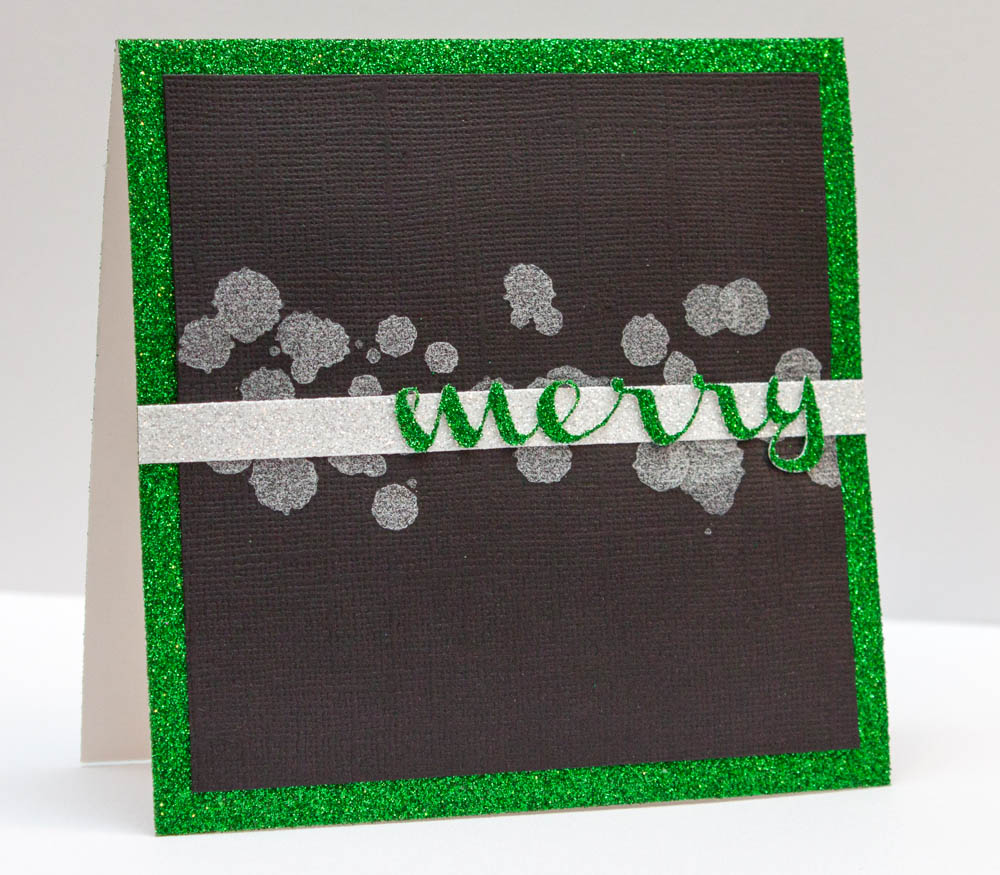 This card has a touch of die-cut magic with a simple “merry” in glitter cardstock. The fun part of this creation isn’t the glitter, though: it’s the splattered paint mist.