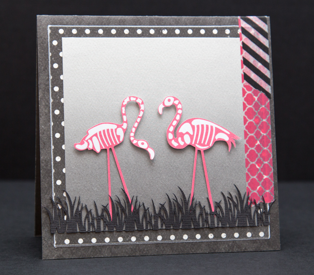 My funny bone was tickled when I made these skeleton-themed cards. I’ve never created a Halloween card with pink before — it had to be done. Skeletal lawn flamingos must be pink!