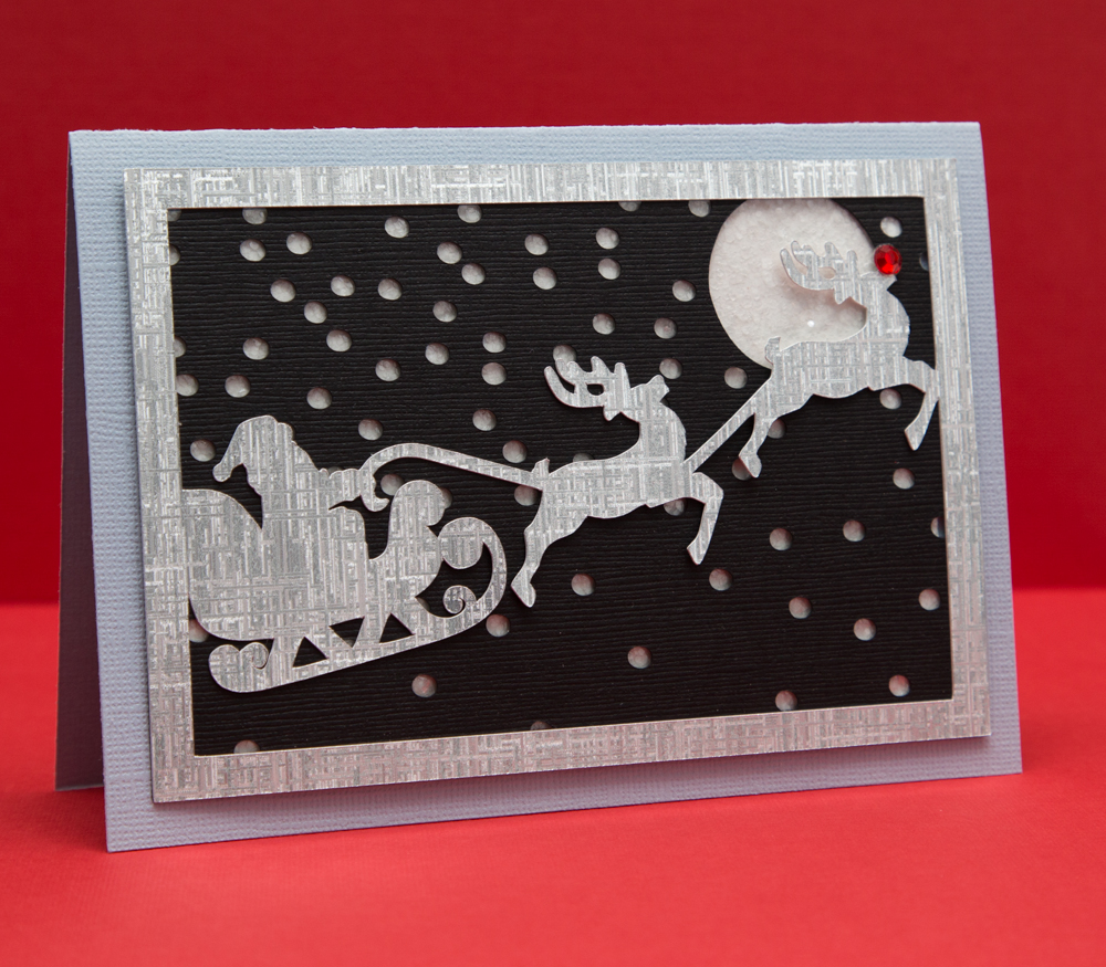 Santa’s on his way, in a silver-coated sleigh. There are lots of layers and texture on this card, with linen-patterned metallic paper, textured cardstock and chunky glitter.